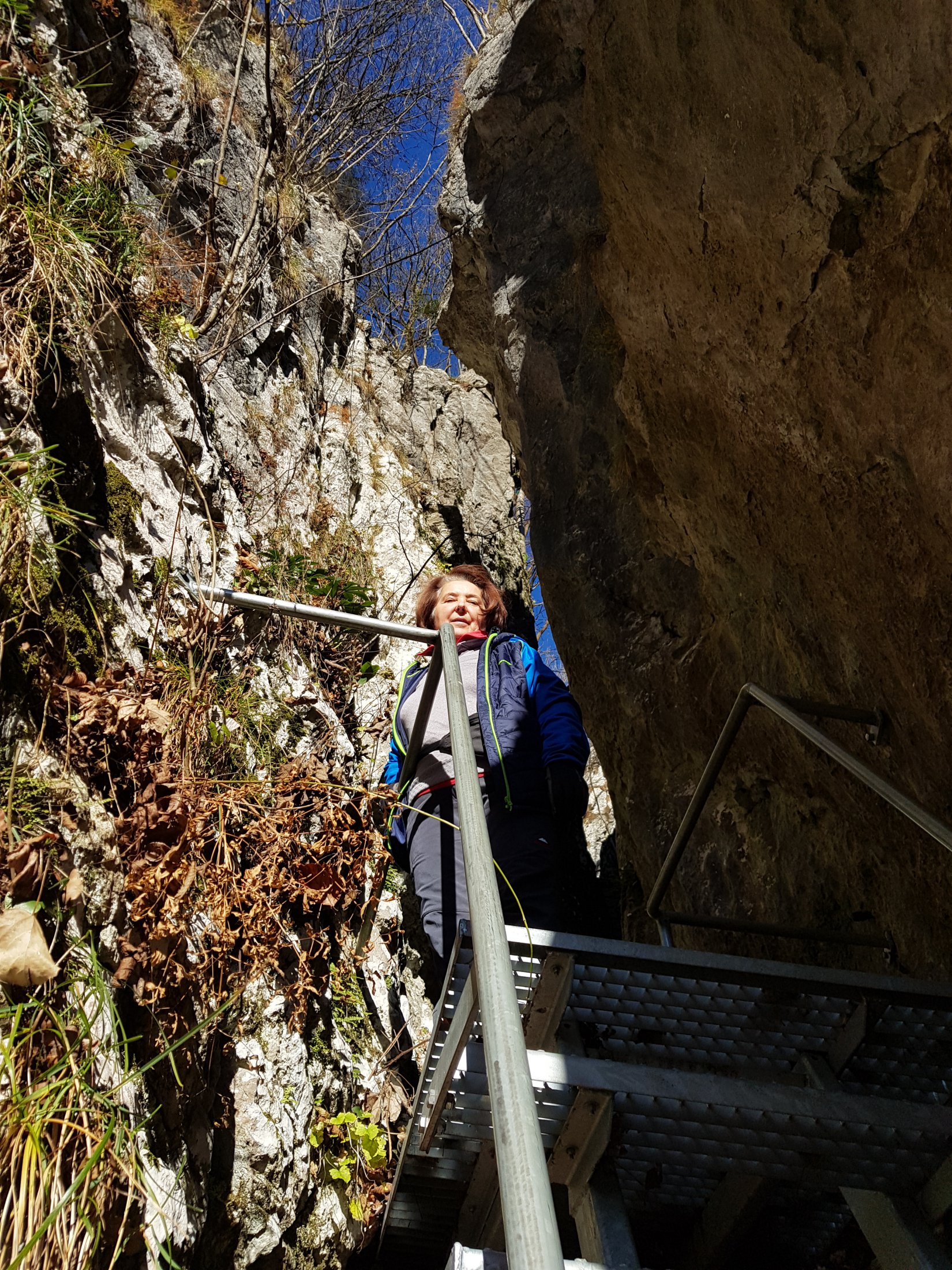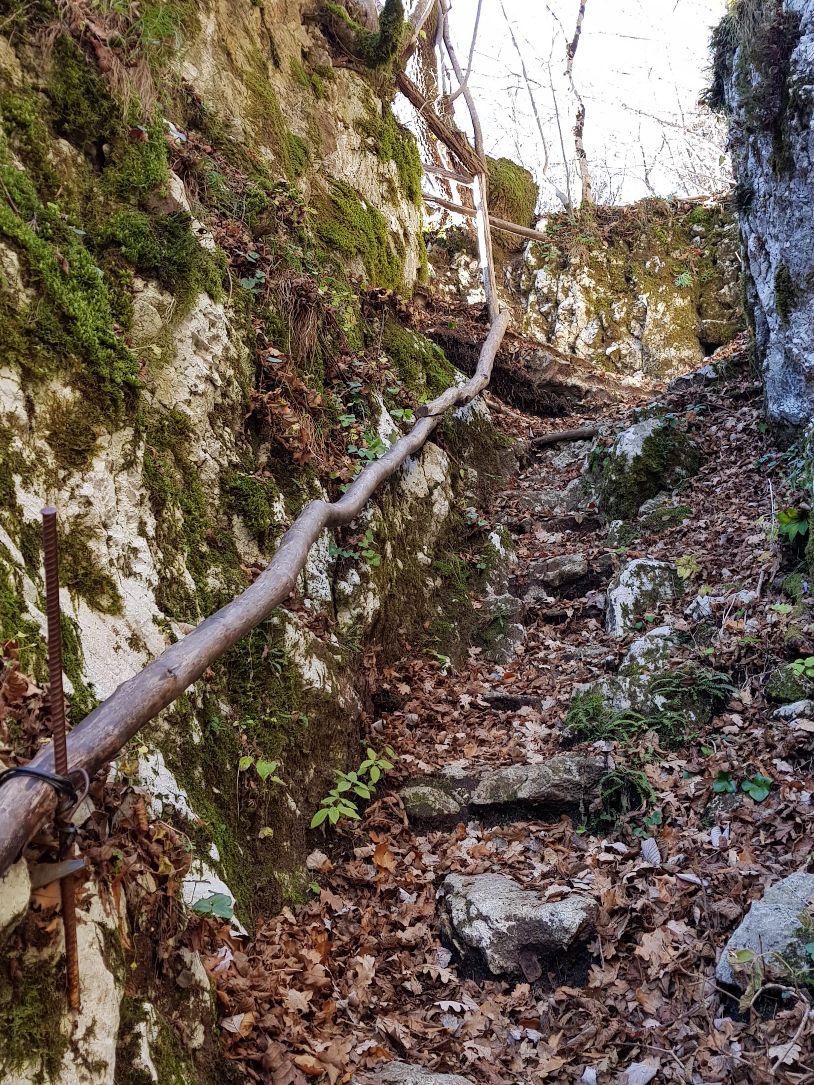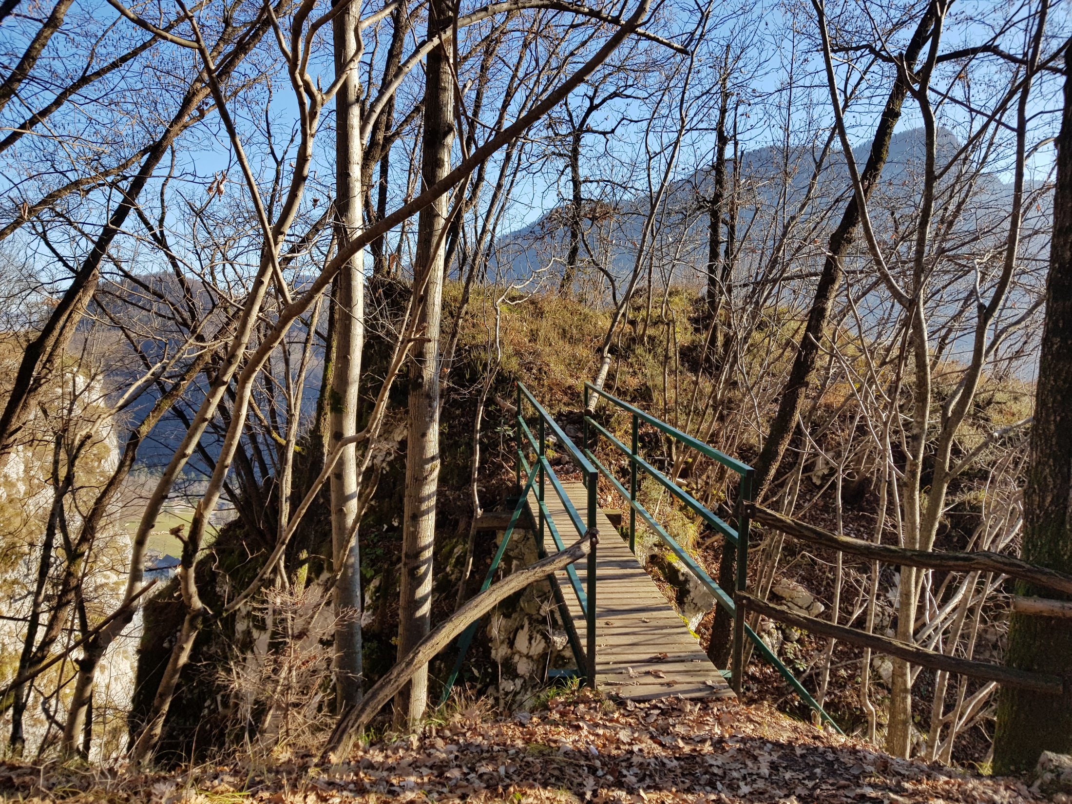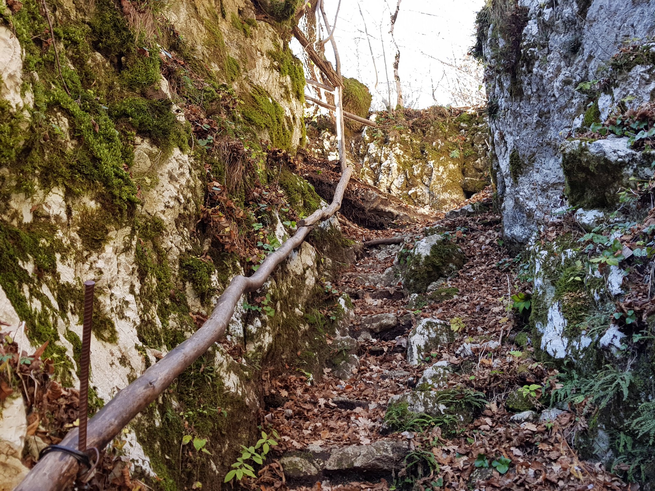 Takoj za slapom se dvigajo jeklene stopnice, ki nas pripeljejo do vrha pečine, Vrh pečine nudi ob lepem vremenu lep razgled na Babji zob in Jelovico v ozadju, na Savo bohinjko in bohinjske gore in proti ljubljanski kotlini.. Vrnemo se po stezi čez travnik in nato po bljižnicah ob asfaltni cesti ali godrnjavčevi poti in čez središče vasi do izhodišča.