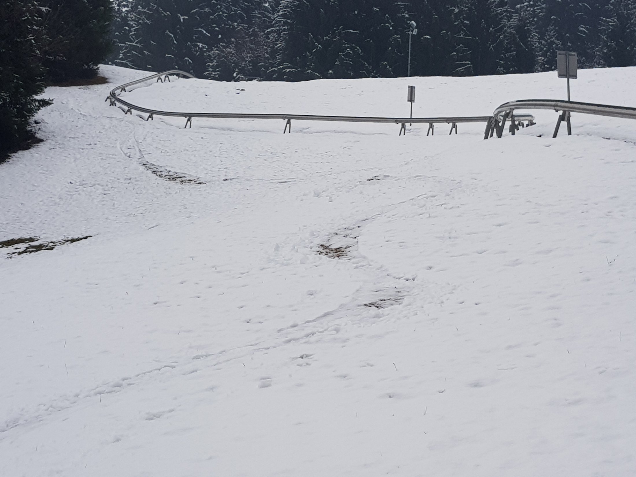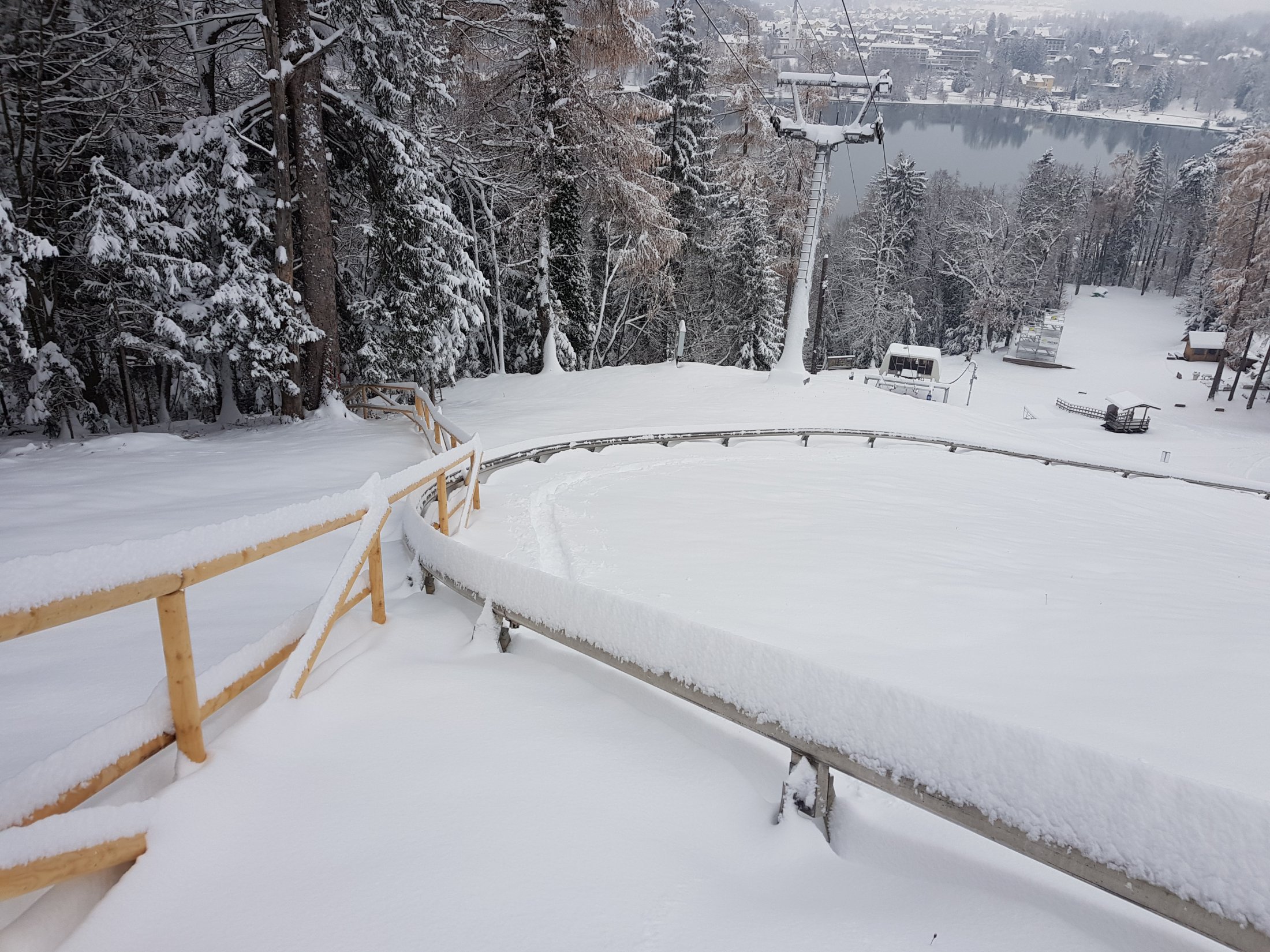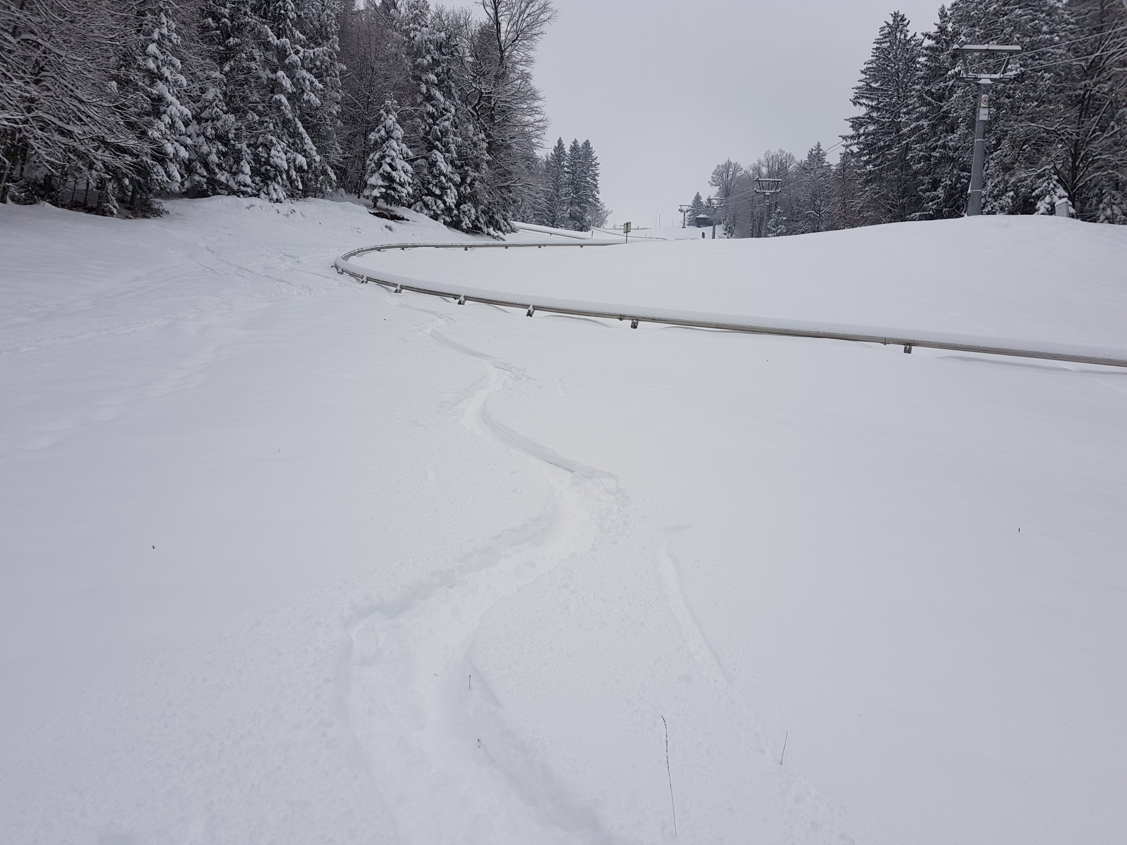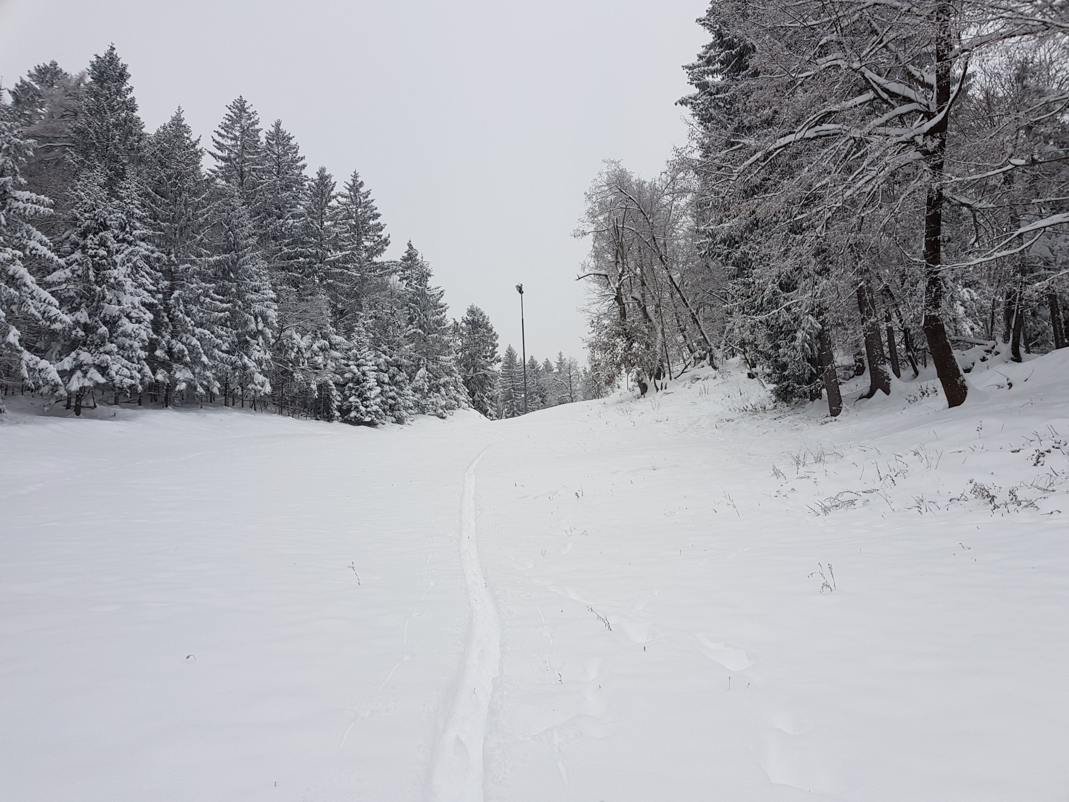 Prvi sneg in hrib za hišo je bilo idealno za jutranjo turo. Na Plani sem zavil na gozdno pot in priplezal do zgornjega dela smučišča. Špura je bila že potegnjena, saj je prvi odsmučal že pred službo. Na vrhnji strmini je še škrtalo, nato pa je šlo vedno bolje. Samo rodelbahn-u se je bilo treba izogibati, saj infrastruktura še ni (ne bo?) pripravila smučišča ( zgodnje napovedi za letošnji sneg so bile za po božiču). Juuhhhhhhuuu!