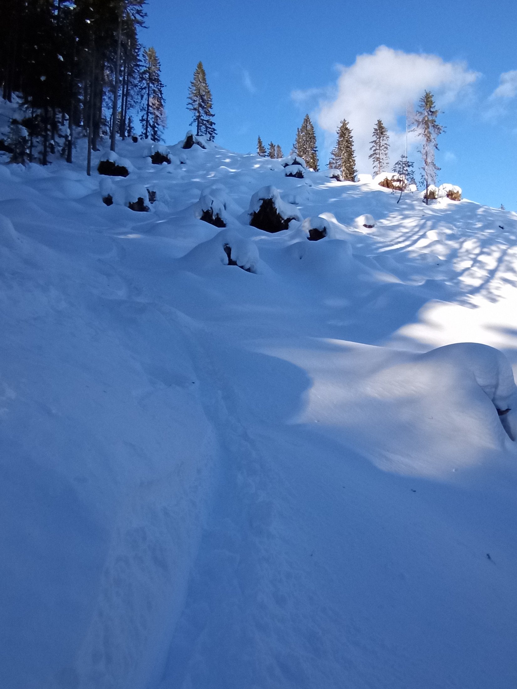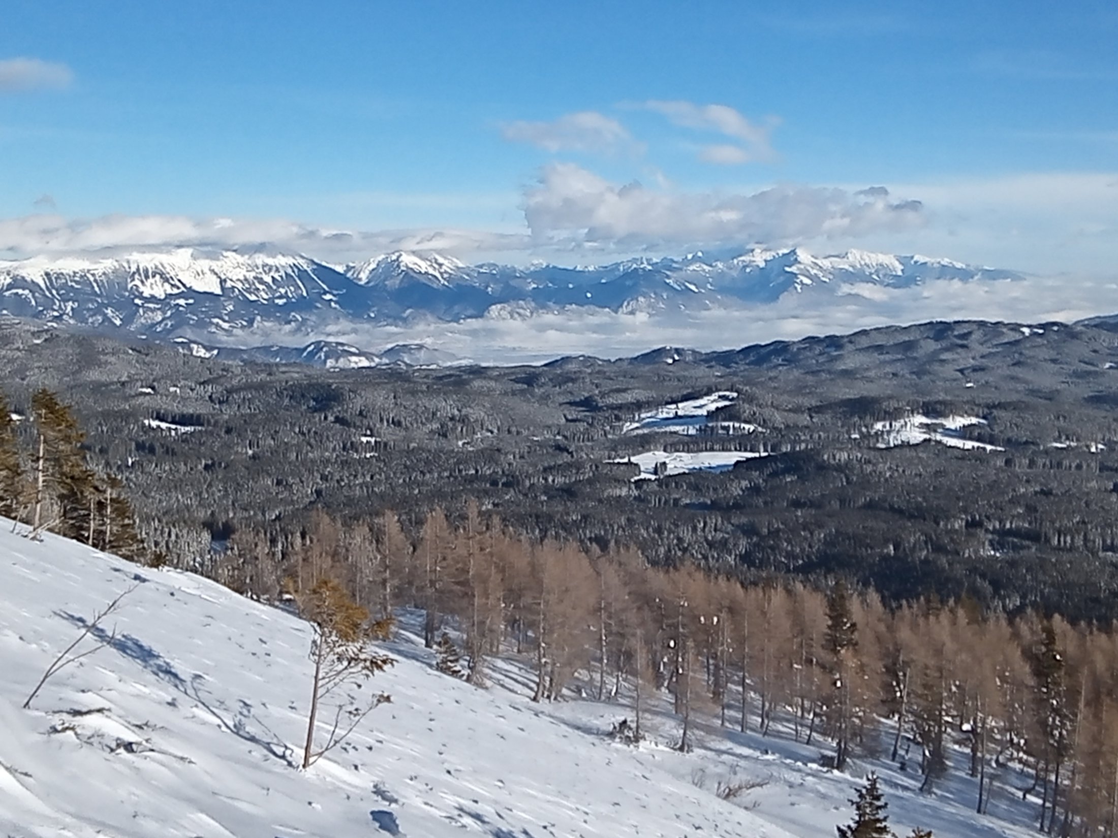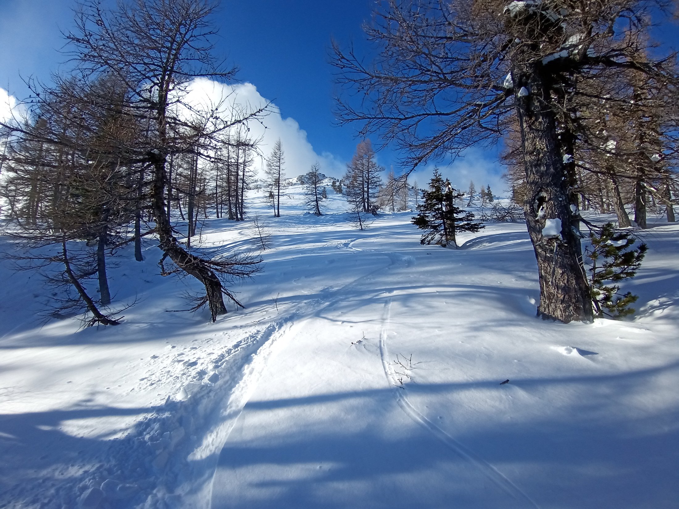 Tokrat se ni , tako da sem gazil nekaj deset metrov do uhojene gazi . V dobrih razmerah nas gaz pripelje na rob, ki nam ponuja lepe razglede na Mali in Veliki Selišnik, Debeli vrh, Mali Draški vrh, Mrežce in pokljuško planoto. Tokrat me je pripeljala pod rob, kjer so predhodniki obrnili. Sam sem nadaljeval nekaj deset metro višje do zadnje smreke, ki je še nudila nekaj zavetja. Z vrhnjega roba je veter odnesel sneg zato sem odsmučal malo nižje do roba s pogledom na omenjene vrhove. Vse nižje pa so bile razmere vse boljše in boljše.