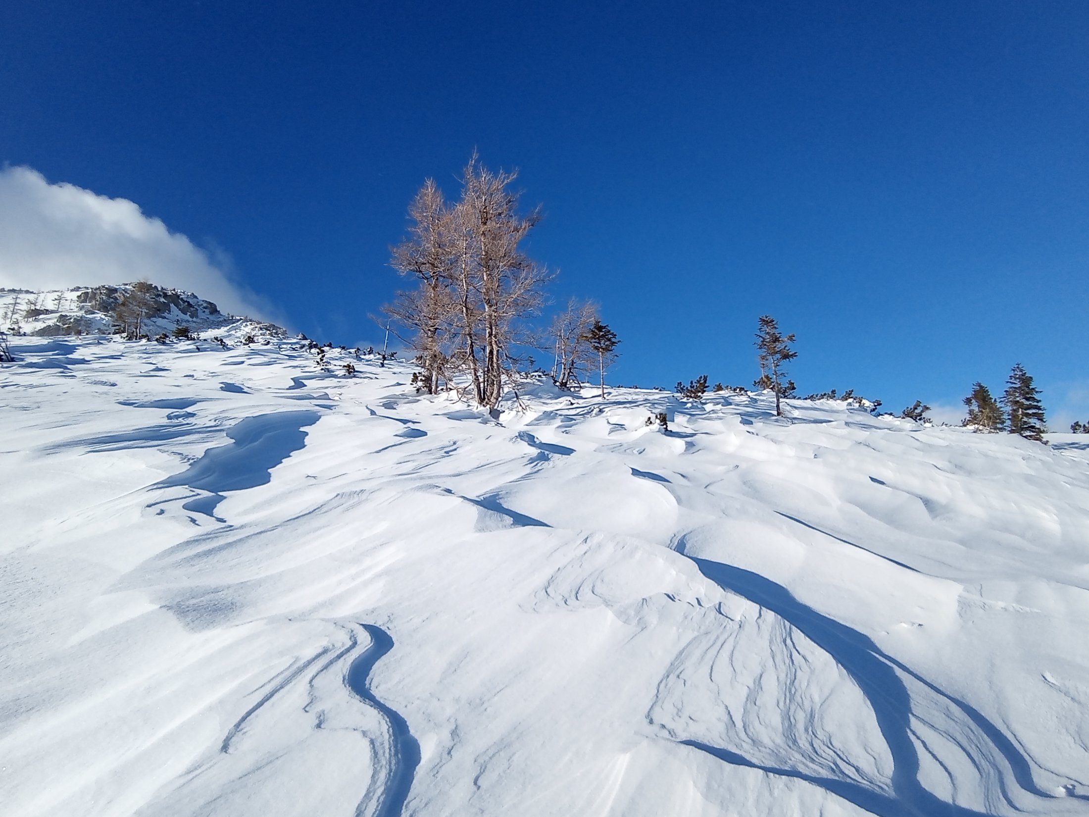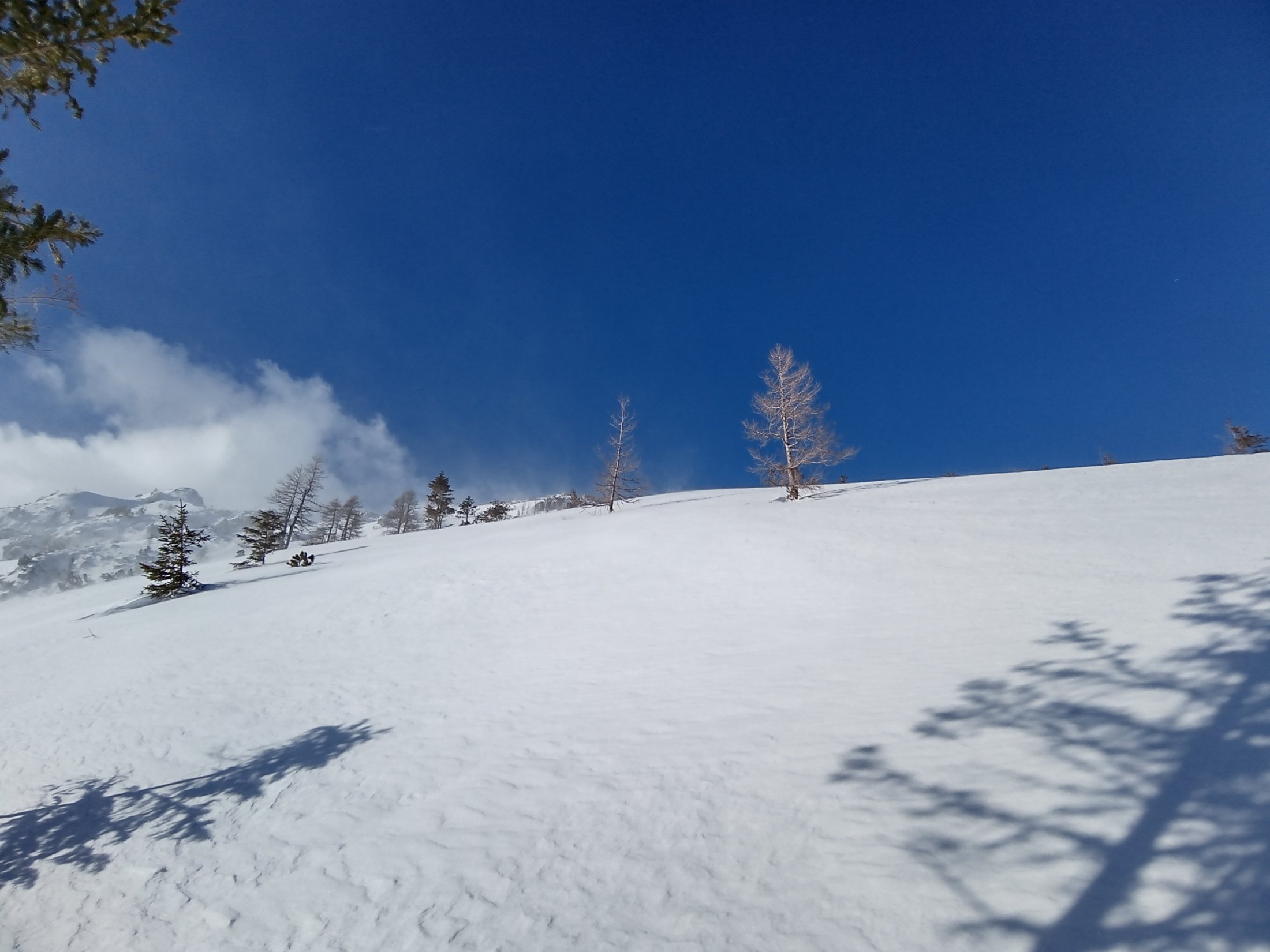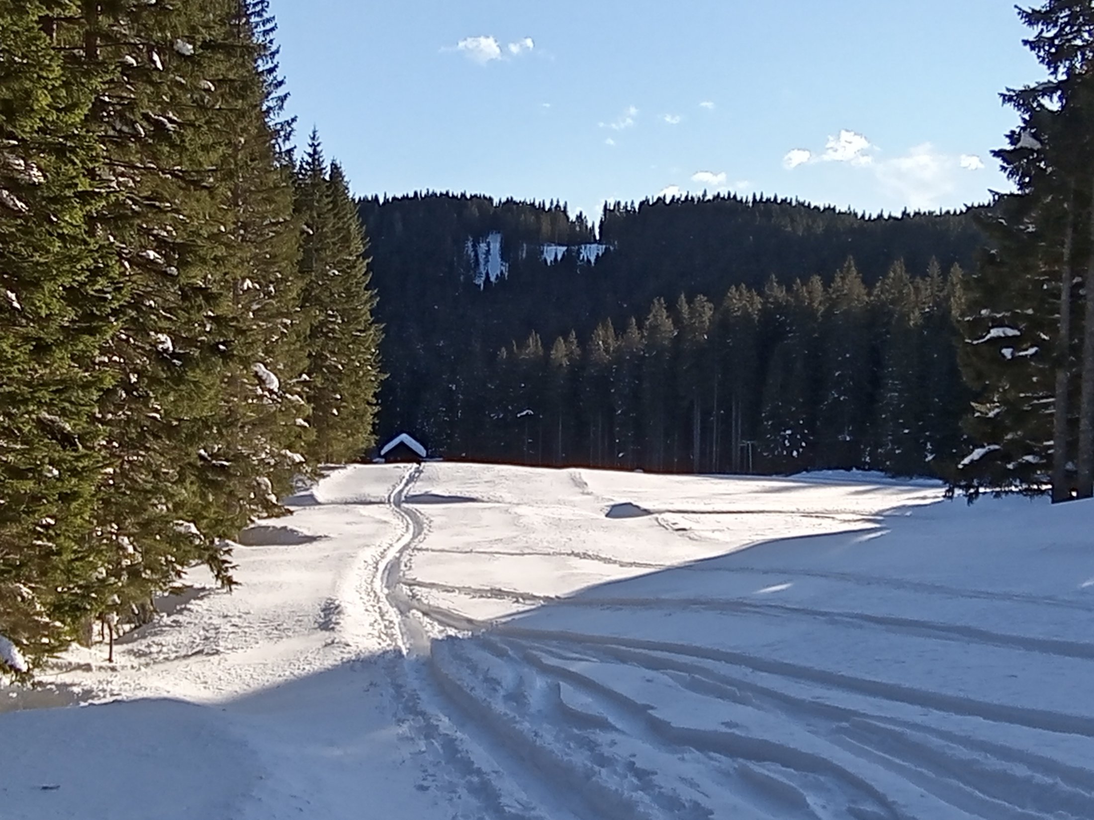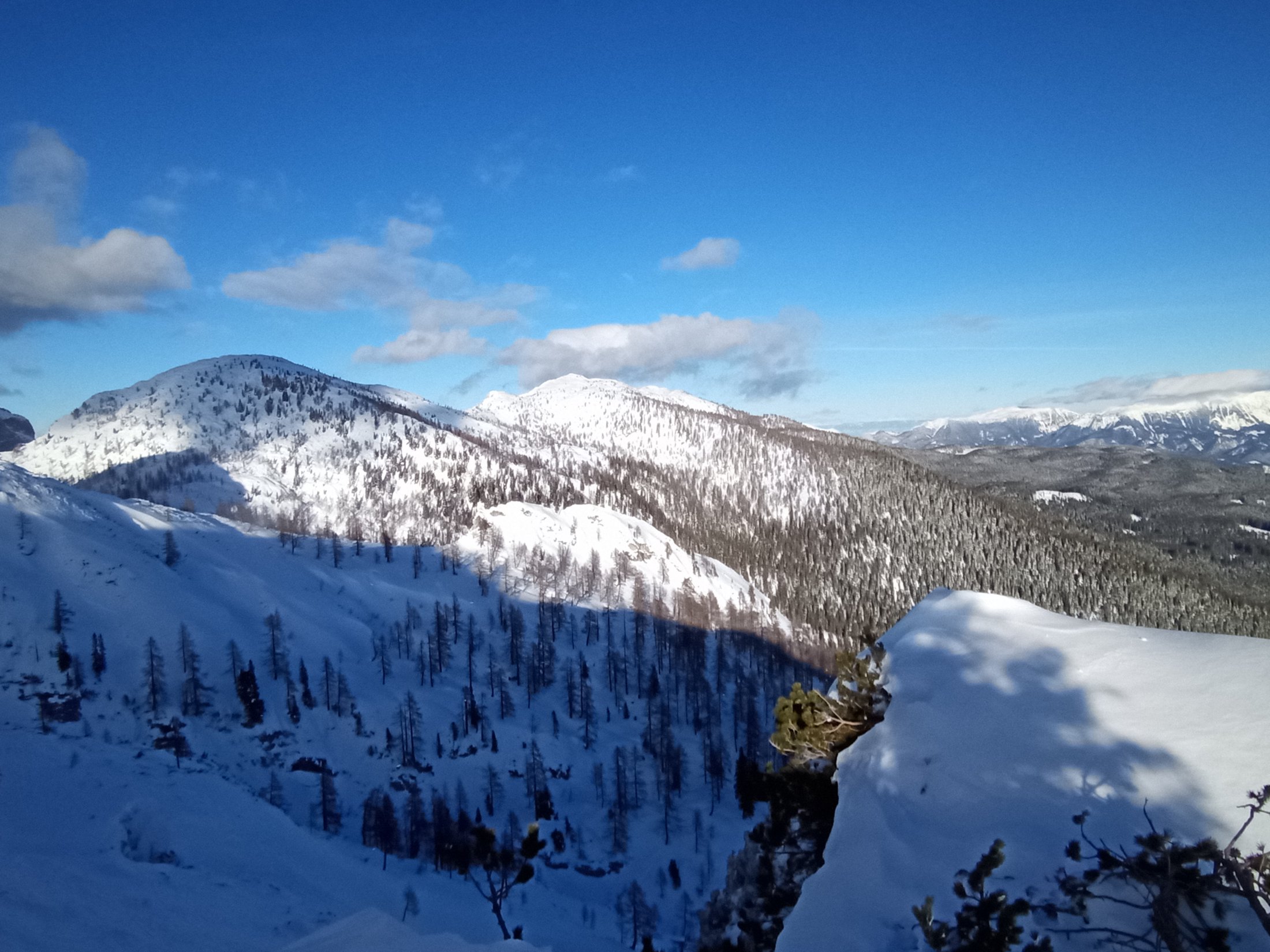 Tokrat se ni , tako da sem gazil nekaj deset metrov do uhojene gazi . V dobrih razmerah nas gaz pripelje na rob, ki nam ponuja lepe razglede na Mali in Veliki Selišnik, Debeli vrh, Mali Draški vrh, Mrežce in pokljuško planoto. Tokrat me je pripeljala pod rob, kjer so predhodniki obrnili. Sam sem nadaljeval nekaj deset metro višje do zadnje smreke, ki je še nudila nekaj zavetja. Z vrhnjega roba je veter odnesel sneg zato sem odsmučal malo nižje do roba s pogledom na omenjene vrhove. Vse nižje pa so bile razmere vse boljše in boljše.