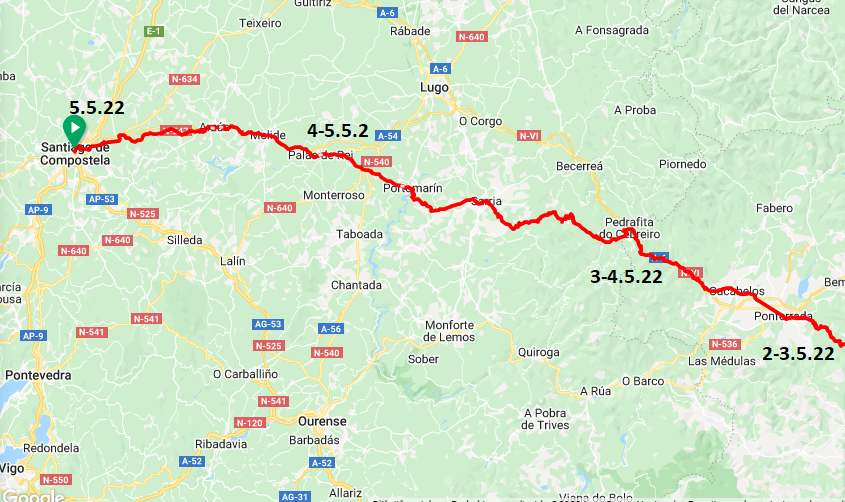 - 4.5.22, Tricastela – Sarria – Palais de Rei ( prihod 4.5.22) , etapa: 75 km ,
