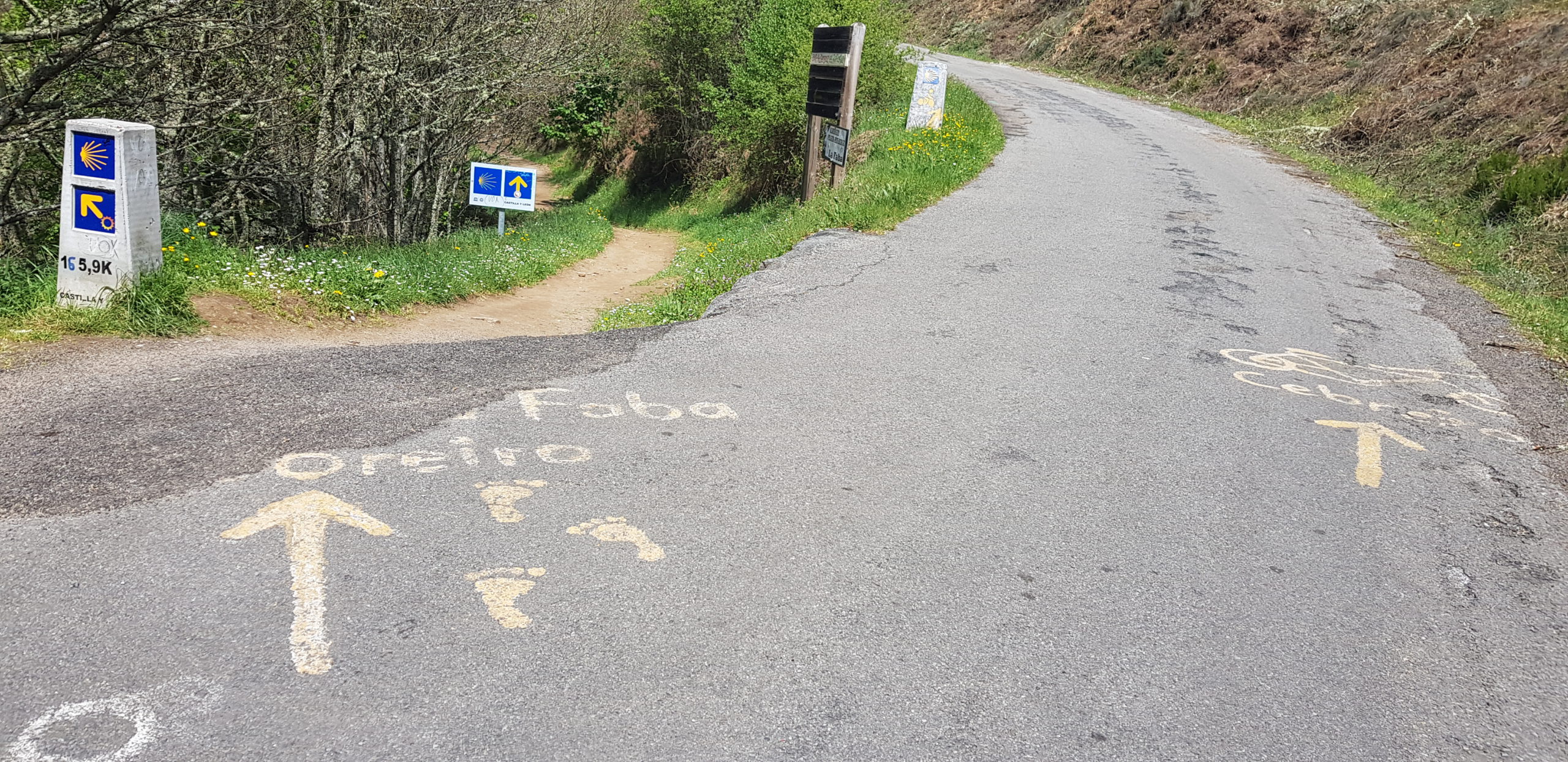 Ta etapa je imela najvišji vzpon na 1302 m visoko vas O Cebreiro. Vzpon se pri začne Las Harreias , 44 km od Ponferade. Kmalu za La Faba ( fižol ), se odcepi pot za kolesarski kamino po cesti: vendar naj bi bila zaprta po besedah domačinke. Tako da sem se vrnil nekaj km nazaj do odcepa in nadaljeval po peš poti. Čeprav je bilo proti koncu na tabil samo še 4km do O Cebreiro , se je porivanje kolesa v breg vleklo slabo uro. Zato pa je bila nagrada večja: lep sprejem v vasi in kosilo z ženo. V hiši iz kamna in kriti s slamo (kot vse hiše) je bila tudi trgovina domače obrti in tipčnih spominkov: keltski obeski, amuleti, keltski simboli, keramični, srebrni, bronasti, železni spominki, nakit, prstani, uhani, obeski, zapestnice in klicalci angelov. V spomin na benediktinske menihe in duhovnike, ki so se od leta 836 udeleževali romanja in naredili tukaj prehod čezi te gore stoji ob cerkvi spomiska plošča. Ob cerkvi je še spomenik Elías-u Valiña Sampedro, ki je bil ena najpomembnejših osebnosti pri oživitvi sodobnega romanja v Santiago. Pri kosilu je obvezen dodatek steklenica vino tinto. Potem je sledil še spust v Tricastela.