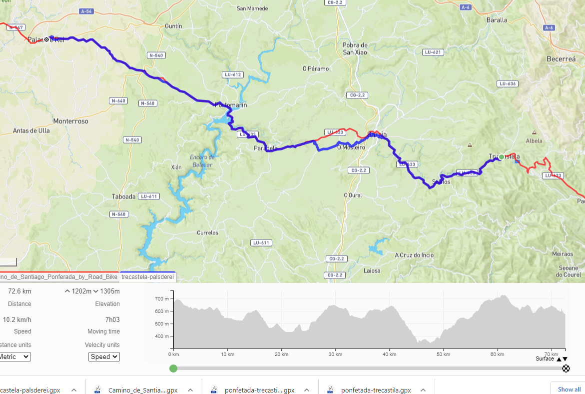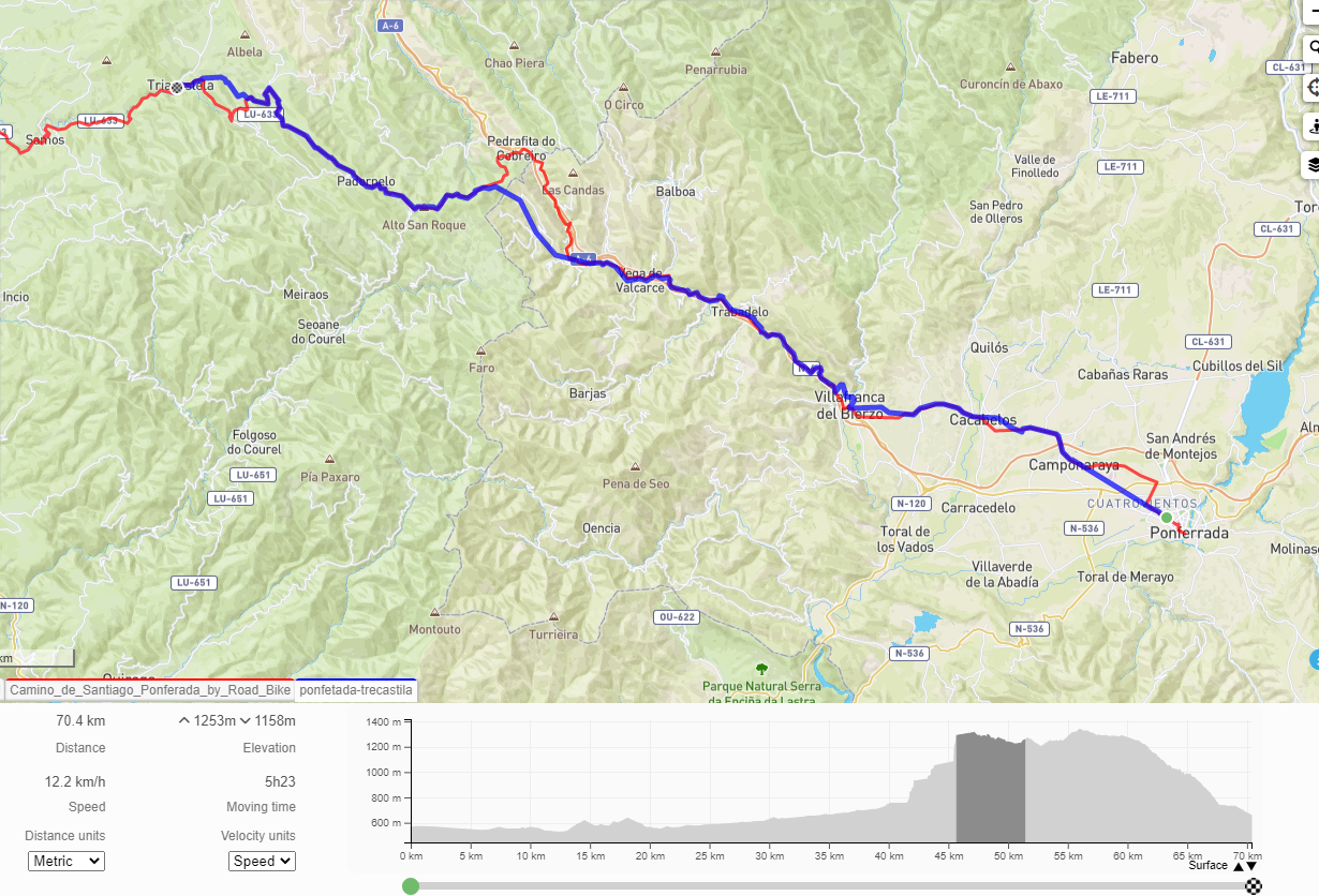 Tudi ta etapa je bila dolga okoli 75 km. Za kolesarjenje po Camino gpx sled ni potrebna. Koristna je za vožnjo po asfaltnih cestah, kar pa bolj spominja na tekmo kot na Camino. Vedno sem se držal kolesarskih oznak za Camino. Pri dolgih spustih in gneči na Caminu pa sem zavil na “carretero”, če bilo možno.