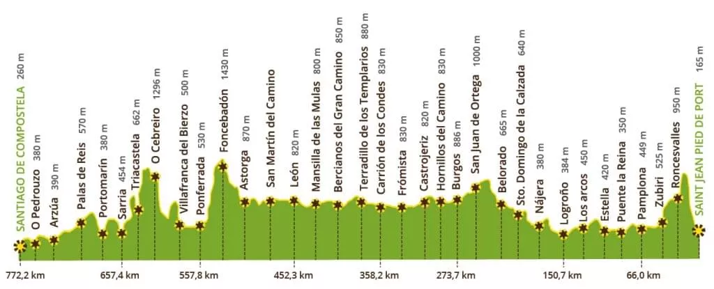 Ima skupni vzpon 3000 metrov in na mnogih njegovih etapah najdemo visokogorske prelaze. Te informacije so še posebej pomembne za romarje, ki želijo opraviti Camino de Santiago s kolesom, saj bo pred tem potreben trening.
