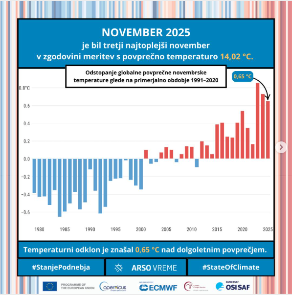 Ali bo december 2025 podrl rekorde? Po podatkih ARSO je bil letošnji november globalno tretji najtoplejši do sedaj.