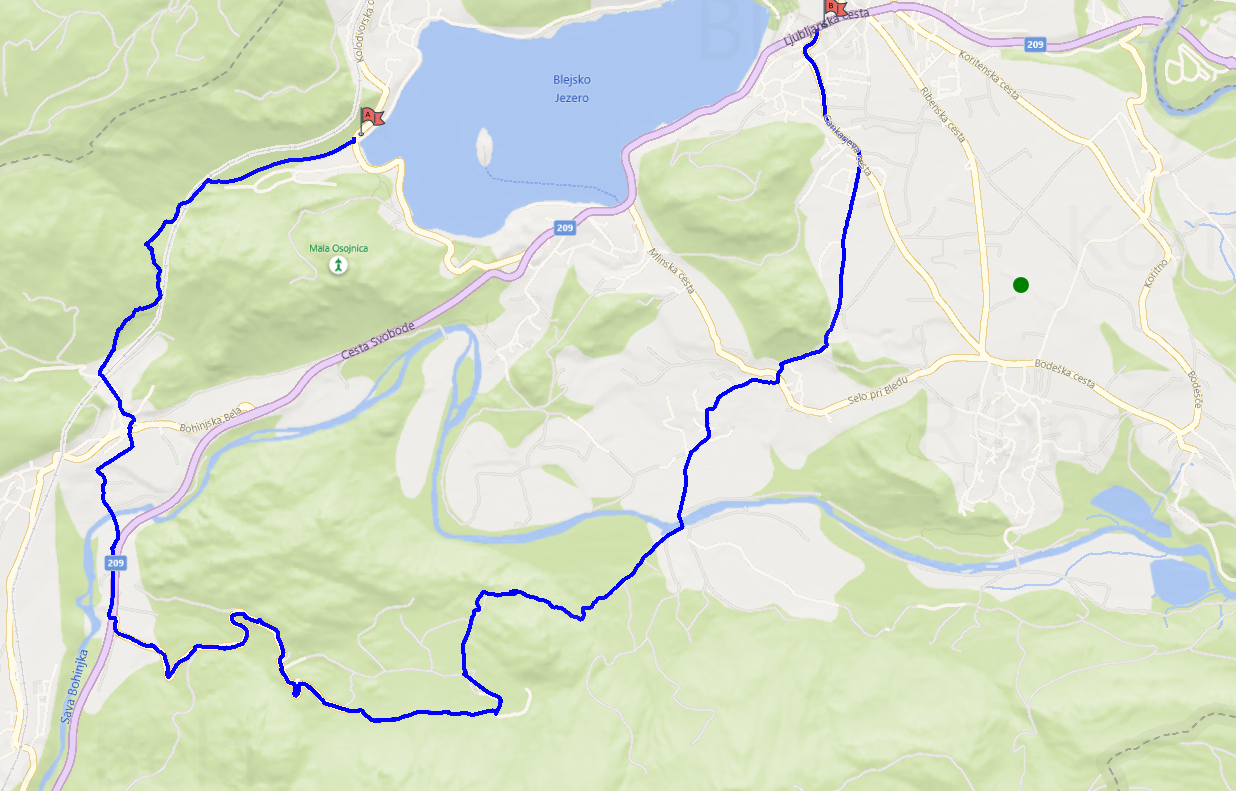 Startal sem na Cankarjevi cesti pri parkirišču, kjer lahko v času poletne turistične sezone parkirate avotmobil. Kolesaril sem v smeri proti Ribnemu. Na križišču pri kapelici sem zavil proti Selu in se spustil po zložnem klancu v Selo. Nato sem nadaljeval v smeri za Mlino in pri odcepu v Mlino za Bohinjsko belo. Mimo vojašnice sem se po strmrm klancu povzpel do glavne cese Bled-Bohinjska bistrica. Po 100m kolesarjenja po glavni cesti sem zavil levo na kolovoz proti Savi. Pot se nato vije ob Savi Bohinjki. Pri nadvozu sem se spustil do reke in po kratki osvežitvi nadaljeval pod mostom in mimo doma Blanskih ribičev v Bohinjsko belo. Najprej šp makadamu do mostu in nato desno po asfaltni cesti trgovine. Ob glavni cesti za trgovino Merkator se lahko odžejate v okrepčevalnici Galetovec. Nato sledi prečkanje glavne ceste in strm vzpon po ozki ulici do odcepa za Veliko Zako. Najprej je kratek ravninski del, ki se spremeni najprej v zložen in na koncu strm klanec. Sledi še spust do kampa in mimo kampa po Kidričevi cesti. proti Mlinu. Ker je bilo že proti večeru, ko je malo sprehajalcev sem kolesaril po sprehajani poti ob jezeru. Za gostiščem “Oštarija Peglezen” sem zavil desno in po kratki strmini in Zaleški cesti prikolesaril do izhodišča.
