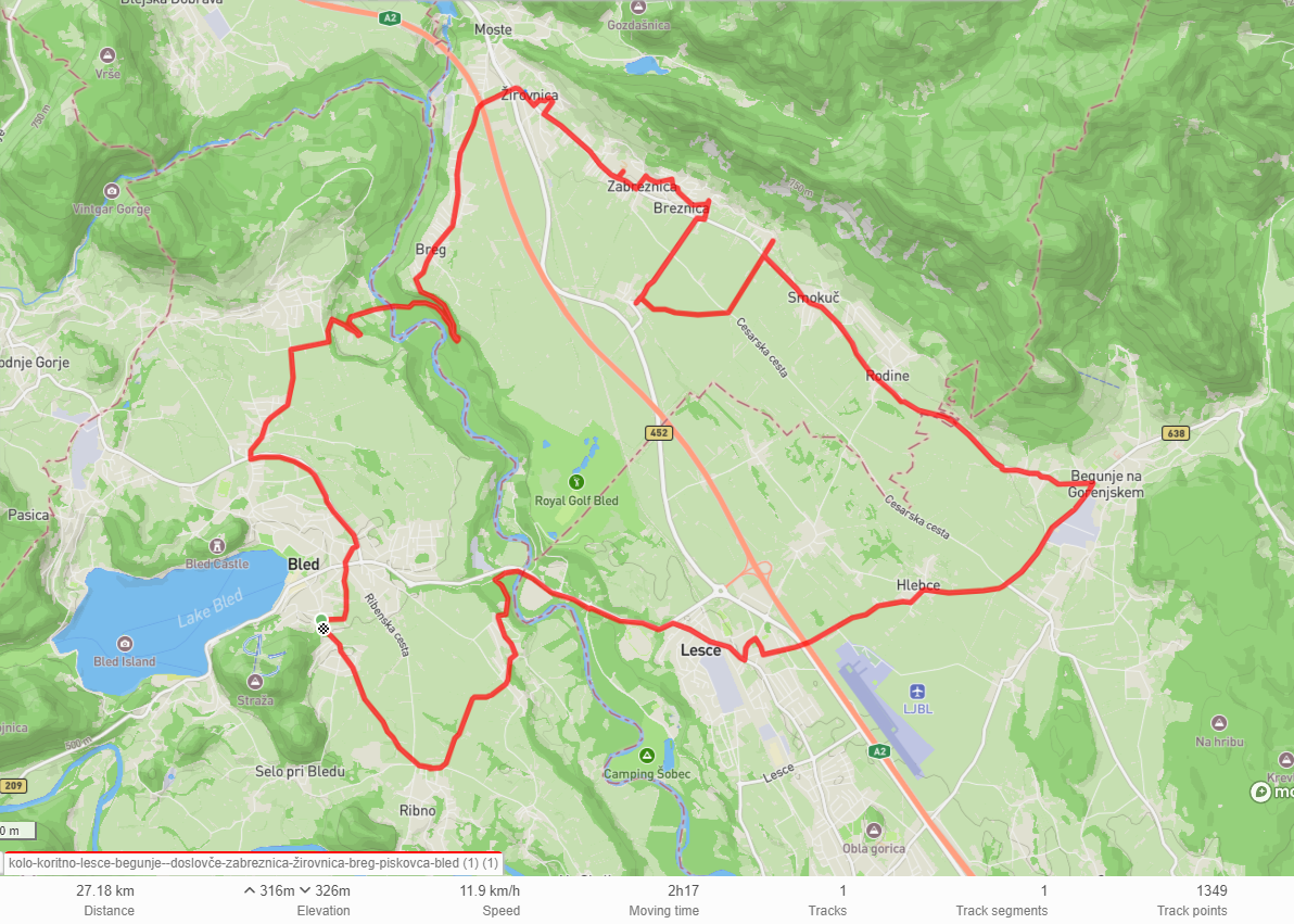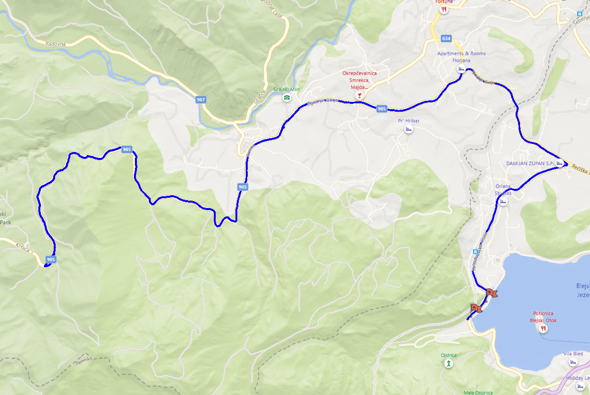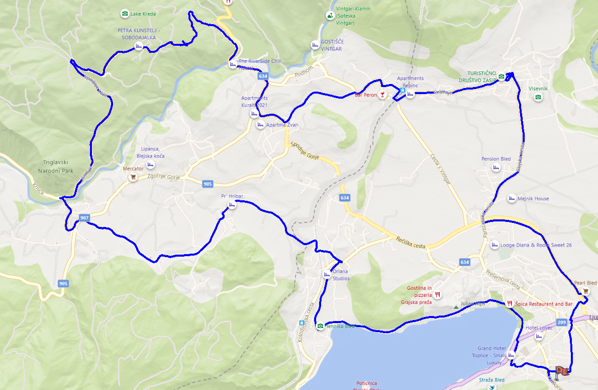Dolžina poti: 18 km Višinska razlika: 400 m Čas kolesarjenja: 2-3 ure Težavnost: Lahka Primerna za: Cestna kolesa Start in cilj: Bled (odvisno od vaše lokacije) Višina štartnega mesta: 504 m Najvišja točka poti: 905 m (Zatrnik)